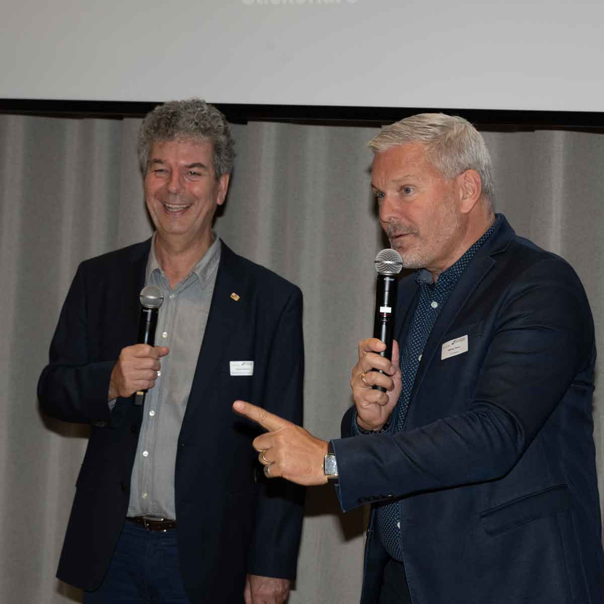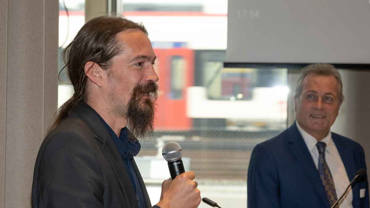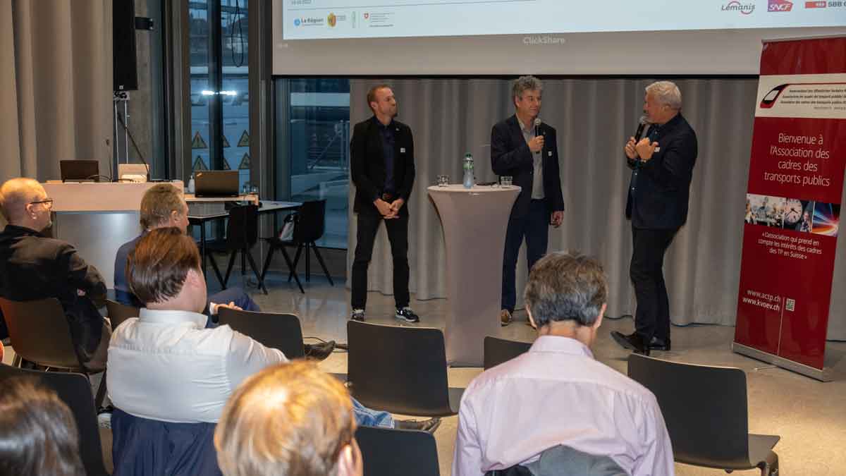 Den zweiten Teil bildete ein Podiumsgespräch mit den beiden CEOs Yves Marclay (RégionAlps) und Mathieu Fleury (Lémanis), moderiert vom neuen Präsidenten der Regionalgruppe, Nicolas Steinmann. Der spannende Austausch zeigte den Teilnehmenden auf, welche Herausforderungen die beiden Verkehrsunternehmungen antreffen und mit welchen möglichen Lösungen sie daran arbeiten.