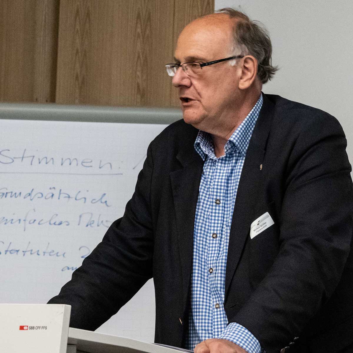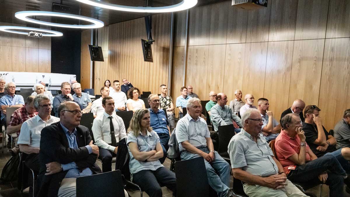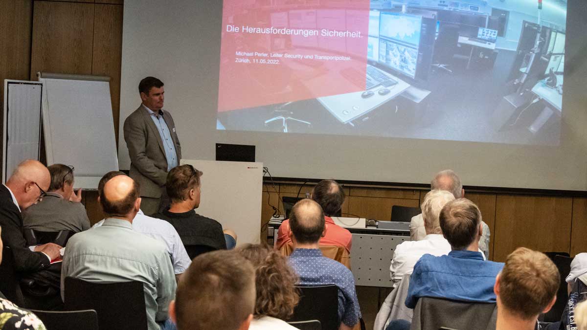 Im Anschluss an die Delegiertenversammlung vom 11. Mai 2022 konnten sich die Gäste ein Bild der aktuellen Sicherheitslage im öffentlichen Verkehr machen. Michael Perler, Leiter Security und TPO der SBB referiert gleichermassen spannend und lehrreich zum Thema «Herausforderung Sicherheit» .