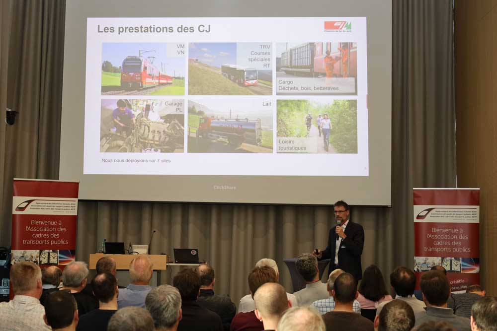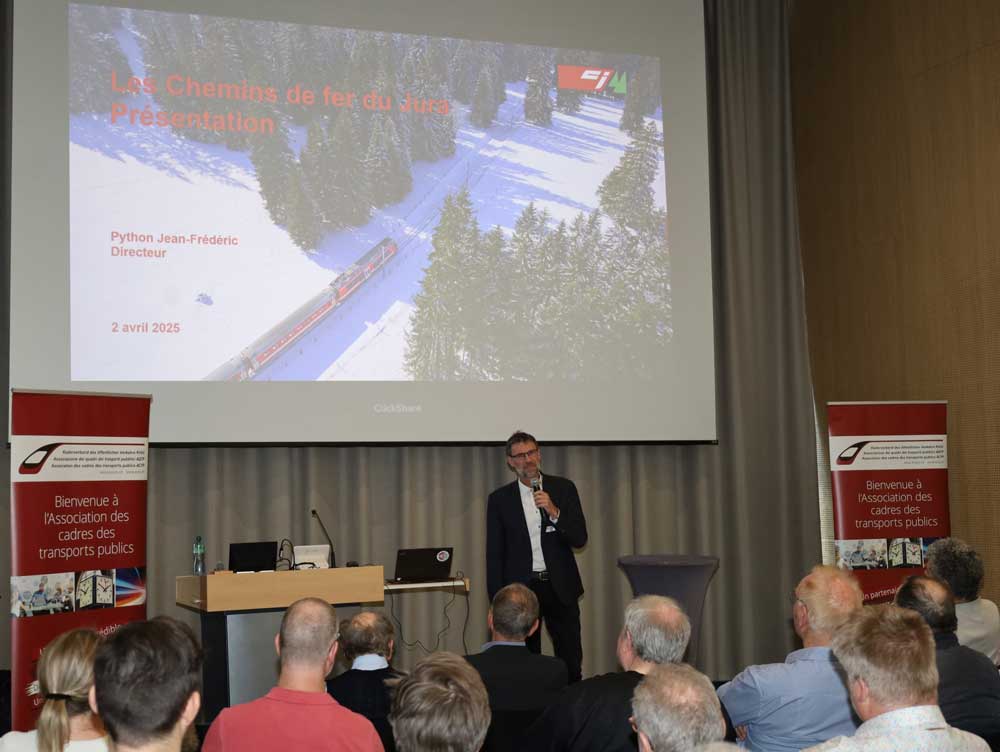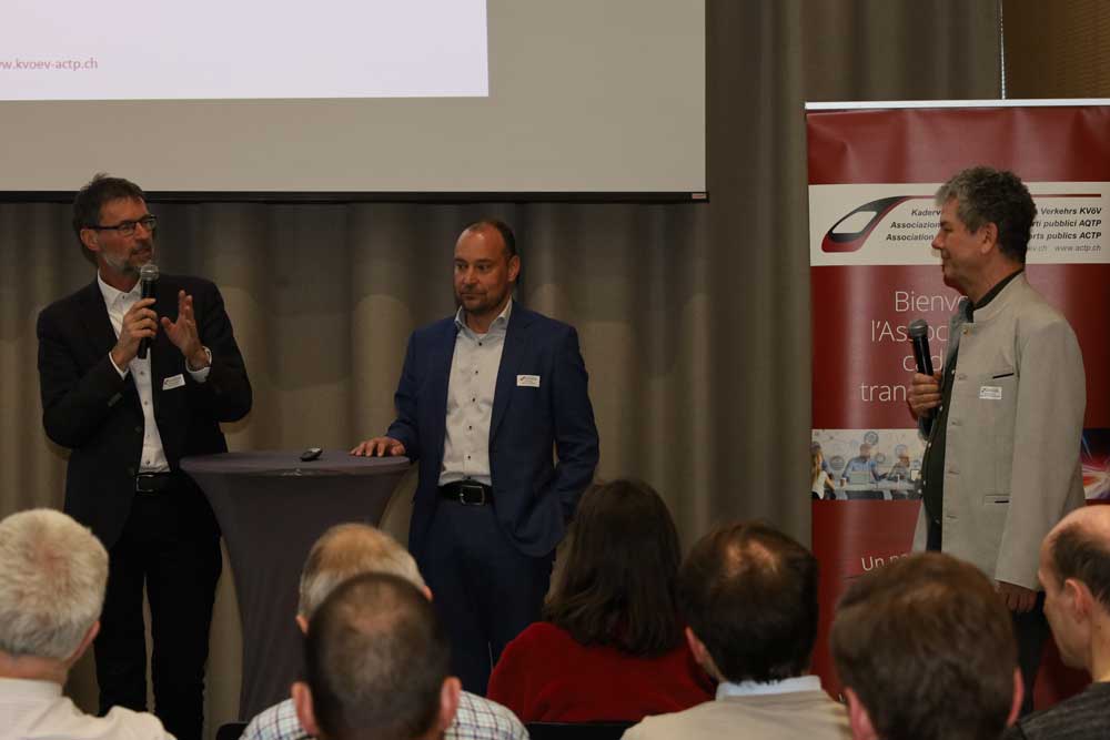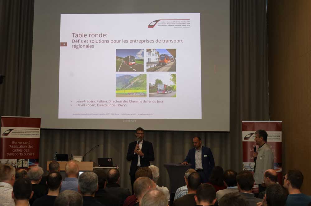 David Robert, Direktor von TRAVYS, und Jean-Frédéric Python, Direktor der Chemins de fer du Jura, teilten ihre Erfahrungen und Visionen, indem sie die Realitäten ihrer jeweiligen Unternehmen gegenüberstellten. Fusionen, Integrationen, Anpassung an neue Mobilitätsbedürfnisse – all diese Themen wurden unter der fachkundigen Moderation von Nicolas Steinmann, Präsident der Regionalgruppe Romandie / Valais des KVöV, angesprochen der die Diskussion leitete.