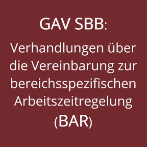 SBB GAV: BAR-Verhandlungen gestartet 24. Januar 2025 Diese Woche haben die Verhandlungen über die vier bereichsspezifischen Arbeits-zeitregelungen (BAR) für das Lokpersonal, das Kundenbegleitpersonal, das Rangierpersonal und das Zugreinigungspersonal bei der Bahnproduktion im Personenverkehr SBB begonnen. Bei SBB Cargo sind BAR-Verhandlungen zu einem späteren Zeitpunkt geplant. In den laufenden Verhandlungen hat am Montag, 20. Januar 2025, […]